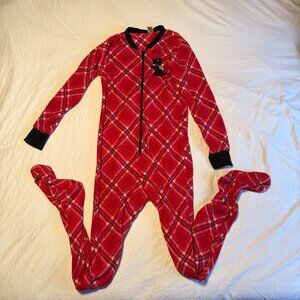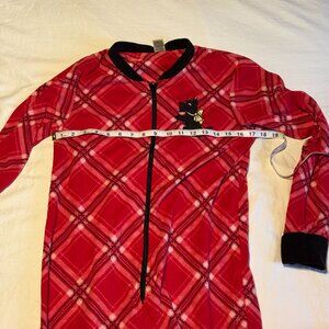 Red Plaid Pajama Adult Onesie S (4-6), black cuffs and collar, applique of a Scottish terrier with yellow bow.