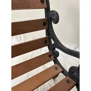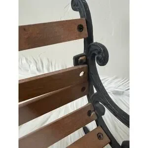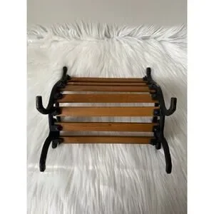 Fun decorative cast iron and wood slat park bench. Great for decorations or to use for your dolls/teddy bears for play. PLEASE NOTE there is some DAMAGE. The second from the top wooden slat has broken off the end- you can still place it in place and it stays but if you move it the slat may fall out again (see pics). The fourth slat down also has a small chip near by the nail. Normal wear for age.