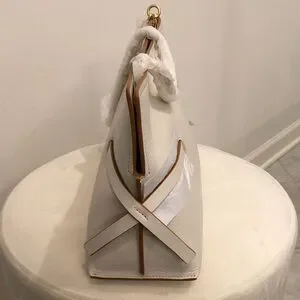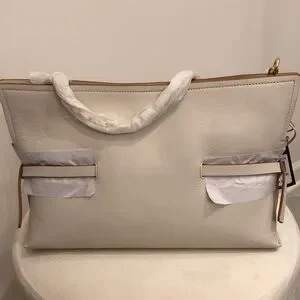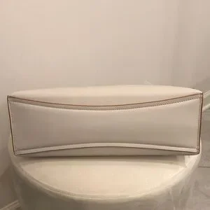 Stylish cream shoulder bag with tan accents. Perfect for everyday use. Elegant and versatile design.