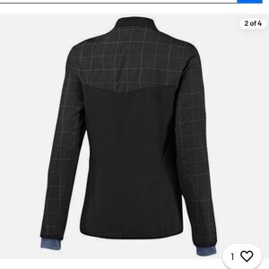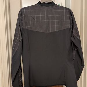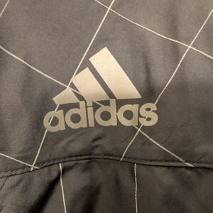 Sleek black windbreaker with checkered pattern. Lightweight and stylish. Features zippered pocket and Adidas logo. Reflective pattern.