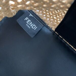 Fendi Peekaboo X-Tote made from woven raffia with black leather trim. It features the "FENDI ROMA" logo embroidered in black thread on the front.