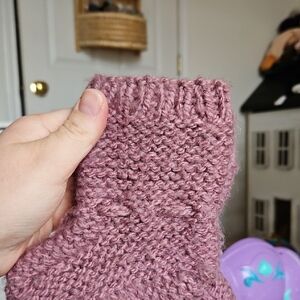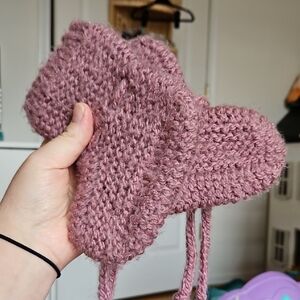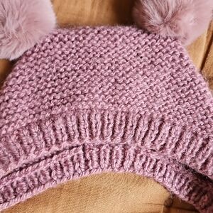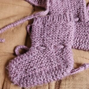acryl/wool blend yarn. hand wash and lay flat to air dry..buttons for easy pom removal. This charming lilac knit hat and booties set is perfect for keeping your child warm and stylish. Featuring playful pom-poms, it's a delightful accessory for any chilly day.