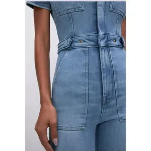 Fan-favorite Fit For Success denim jumpsuit by Good American — insanely flattering on all body types with that signature stretch that even lets you size down. Features a sleek hidden front zipper, collar neckline, short sleeves, snap-button waist, and straight-leg silhouette. Pockets on the chest, sides, and back. Fast shipping.