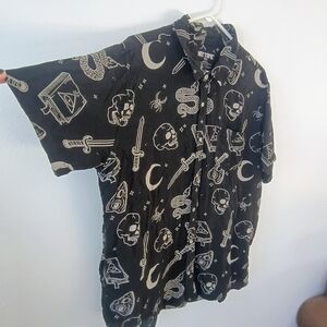 Classic Hot Topic button-up shirt featuring an allover occult-inspired print with skulls, snakes, daggers, moons, spell books, and gothic symbols. Lightweight woven rayon with a relaxed drape, perfect for alternative streetwear, festival fits, or statement layering. Short sleeve silhouette with full button front and pointed collar.