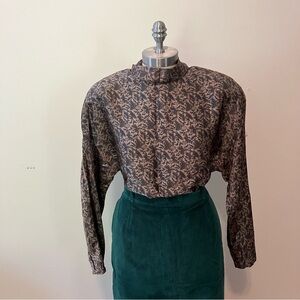Vintage Talbots silk turtleneck blouse. Button neck with key-hole opening. Butterfly and floral pattern. Shoulder pads.