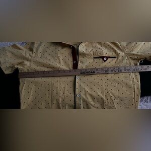 Stylish yellow shirt with navy collar and accents. Features a button-up front and short sleeves. Perfect for casual outings. Slim cut includes darts front and back for tailored fit. Pit to pit measures approximately 22.5inches. Pet and smoke free home. Excellent pre worn condition. No stains or flaws. Business Casual, Men’s Wear, Bright Colored Shirt, Fashion Statement Shirt