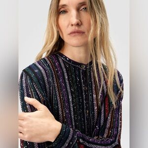 A feminine serafino blouse with luminous charm, featuring a mandarin collar and essential silhouette. Made from herringbone striped knit, it is adorned with sequins and lamé threads that enhance its dynamism with sparkling reflections. A piece designed to add a brilliant touch to everyday outfits.