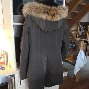black jacket featuring a luxurious fur trim. Ideal for winter wear. size xl as marked but fits medium. parajumpers jacket very good condition