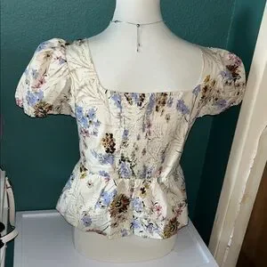 Embrace elegance with this floral puff sleeve top. Perfect for any occasion, this cream-colored blouse features a delicate floral pattern that adds a touch of sophistication to your wardrobe.