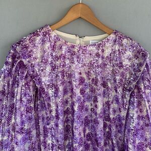 Shimmering purple sequin blouse. Features floral pattern. Short sleeves with a loose fit.