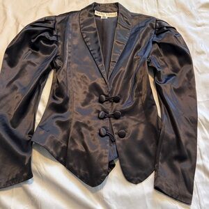 True vintage Norma Kamali blouse, likely from the 1980s, made in the USA. This is a striking, architectural piece with all the signature Kamali drama. Luxe satin finish with a subtle sheen, strong structured shoulders, puff sleeves, and an elegant fitted waist. Finished with unique fabric-covered loop button closures down the front for a sculptural, high-fashion look.