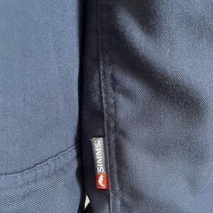 Simms button down long sleeve shirt. Two chest pockets that Velcro shut. Lined inside for extra warmth. A few small snags in one spot on the front (last photo) that aren’t super noticeable.