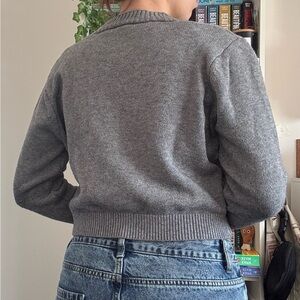 Chic charcoal cardigan with button-up front. Features a stylish cable knit design. Ideal for casual layering. The sleeves fall short on me