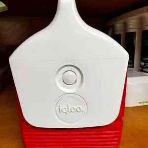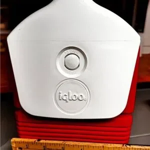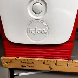 Compact Igloo cooler with a vibrant red and white design. Perfect for keeping drinks cold.
