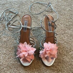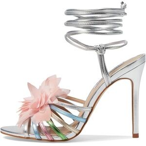 Steve Madden Jolisa heeled sandal silver leather floral wrap around ankle shoe