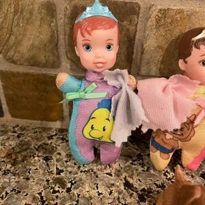 So adorable. 4 inches tall. Excellent condition each with their own blankets! The tags were cut years ago. The tags were so big it took away from the babies. Cinderella Belle and Ariel. Themed Jammie’s. Clean home always. Will come with a small Barbie dog.