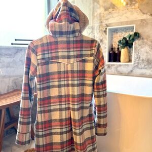 Cozy plaid hooded coat by Billabong in a classic fall color palette of cream, charcoal, and rust. This double-breasted style has a flattering tailored shape while still feeling warm and comfortable — perfect for fall layering and winter outings. Cute back pleat.
