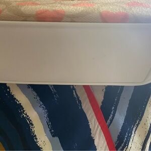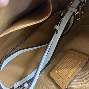 Stylish Coach tote with tan interior. Features white leather straps and gold hardware.