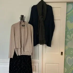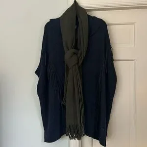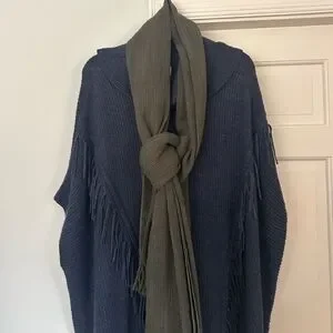 Stylish navy sweater paired with an olive scarf. Perfect for layering.