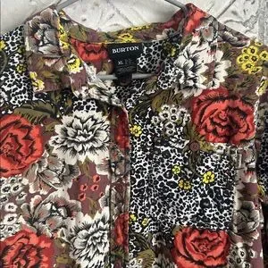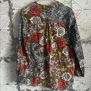 Vibrant top with floral design. Features red, white, black, and yellow hues. Perfect for a bold look.