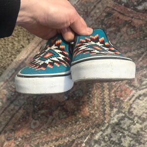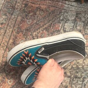 Vans slip-on shoes with a striking geometric/aztec pattern. Features teal, black, and red accents. Women’s 9 or men’s 7.5. Smoke free home and only work a few times!