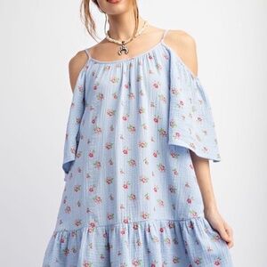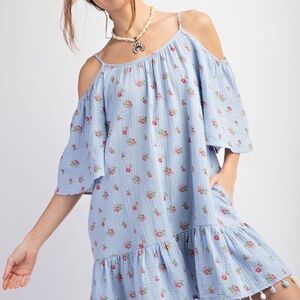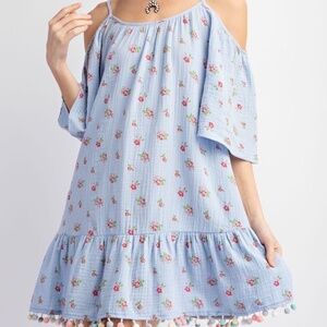 New Easel Cold Shoulder Dress Pom Pom Trim Ruffle Gauze Blue Floral Pockets