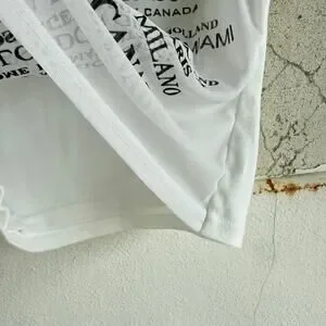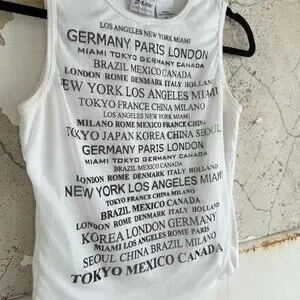 Vintage Y2K city print tank top in white cotton with an allover graphic of world cities, London, Paris, Tokyo, New York, Seoul, Miami, and more. Fitted sleeveless silhouette with that early-2000s retro look. The front is double-layered, with the printed mesh-like outer panel over a soft cotton tank, exactly how JR-S.com did their Cyber Generation novelty tops in the early internet era. Easy stretch, clean crew neckline, and that unmistakable Y2K graphic energy.