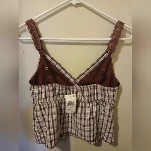 This stylish women's top features a classic red plaid pattern with elegant lace trim. Perfect for casual outings or a chic day at the office.