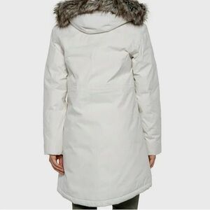 Elegant cream winter coat by The North Face. Features a cozy fur-lined hood. Ideal for cold weather. Size XL.