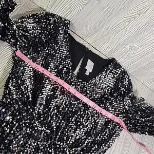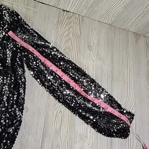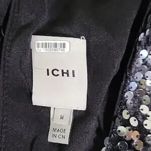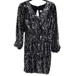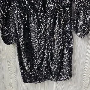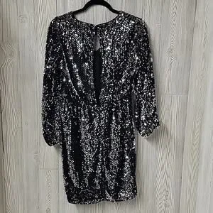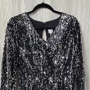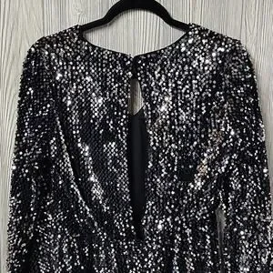 ICHI Wilde Black Silver Sequin Long Sleeve Dress V Neck Open Back Medium NEW