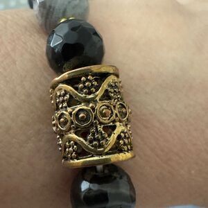 Handmade one of a kind bracelet featuring 10 mm facet cut black banded agate beads with natural gray banding. Finished with an vintage gold-tone brass/copper focal bead and small gold-tone alloy spacer beads. Nickel-free. Gift boxed.