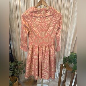 This is a handmade 1960s pink and gold brocade swing coat featuring a large floral/damask pattern. It is made from a rich brocade jacquard fabric with metallic gold threads woven into a pink background. The garment has the silhouette of a swing coat or a fit-and-flare dress, with a defined waist and a full, flowing skirt. It features a collar and three-quarter length cuffed sleeves. The coat is fully lined. It is in fantastic shape considering its age, however, it does have some scrapes to the bottom Button, see pictures. This is perfect for spring. No size is marked: