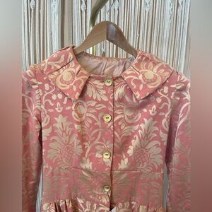 Vintage pink and gold floral jacquard brocade coat with Peter Pan collar