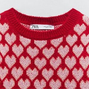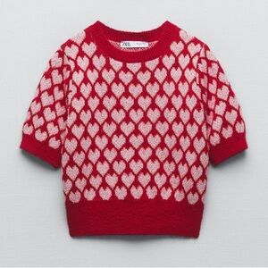 Chic short-sleeve sweater. Features heart pattern. Perfect for layering.