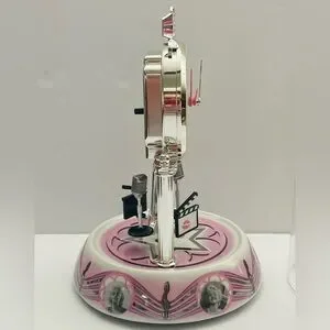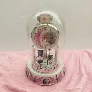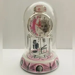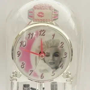 This vintage 2009 clock features the iconic Marilyn Monroe and amazing details. Add some retro charm to your home with this vintage style. Featuring quartz movement and rotating pendulum in a delightful pink, black and white design. Uses 2 AA batteries (not included) Smoke free, pet free home.