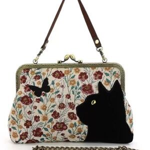 Charming women's bag featuring a floral pattern with a black cat design. Perfect for adding a touch of whimsy to your outfit. Clutch bag made of tapestry fabric with a black flocked cat with butterfly on one side. This bag comes with a metal chain strap in an antique brass and a short faux leather handle.