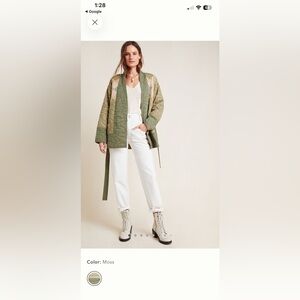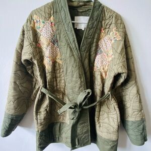 Stylish green quilted kimono jacket with a tie belt. Features intricate stitching and patchwork details. The jacket in the image is the Anthropologie Quilted Patchwork Kimono Jacket. It is a kimono-style, open-front jacket with a removable belt and side slant pockets.