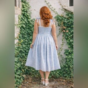 Blue gingham organza sleeveless a-line midi dress with sweetheart neckline trimmed in lace - she’s Dorothy-coded.
