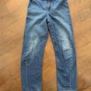 Chic barrel leg design. Timeless blue denim. Perfect for casual wear.