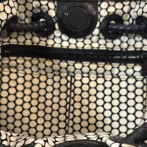 Chic Brighton shoulder bag with floral design. Features black base with white and yellow flowers. Elegant braided handles and signature charm.