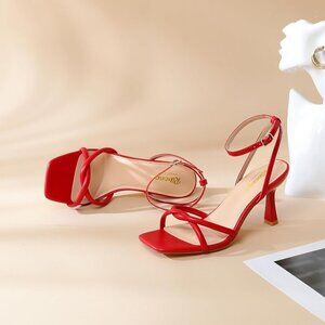 Women's Red Square Open Toe Kitten Strappy Ankle Strap Heeled Sandals Shoes