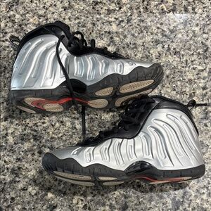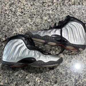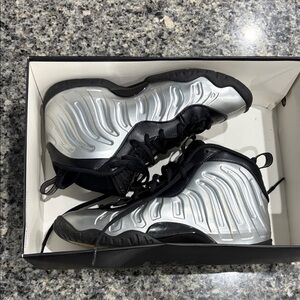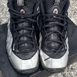 Stylish Nike sneakers for kids. Features a sleek black and silver design. Comfortable and durable for everyday wear.