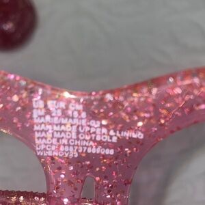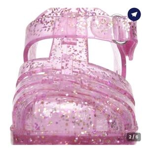 Shimmering pink sandals with glitter finish. Easy strap closure. Fun and stylish for kids.