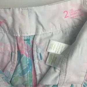These are Lilly Pulitzer Callahan shorts in size 2, featuring a vibrant multicolor "Let's Cha Cha" pattern on a turquoise background.