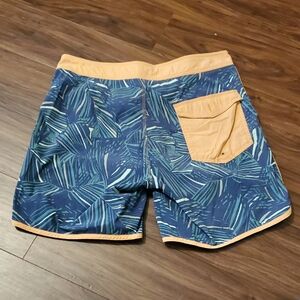 Stylish board shorts with a tropical leaf pattern. Features a vibrant blue design with orange accents. Ideal for beach adventures. Great condition!