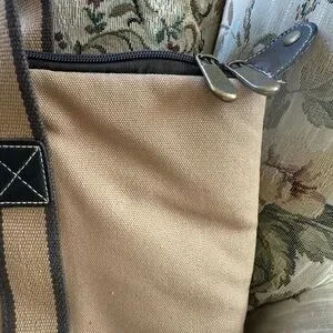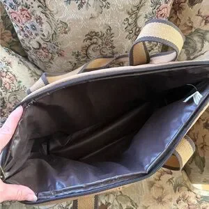 Vintage tan satchel with rich brown accents. Features sturdy handles and secure zip closure. Ideal for daily use. It has an insulated inside for a picnic or day at the beach. In good condition, no smell and no rips or flaws except the logo has some wear and some fabric is discolored due to age. Stitching is exquisite.