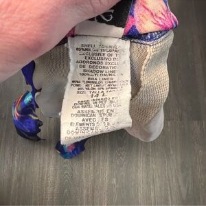 Bright and bold vintage one-piece swimsuit by Slim Allure featuring a colorful tropical floral print on a deep blue background. Flattering, classic vintage cut—great for the beach, pool, or worn as a bodysuit with shorts or a skirt.