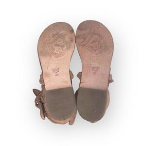A few minor marks on the leather at left sandal. Small marks at the leather wraps. Otherwise, perfection. Lightly worn once or twice with very light wear showing at soles. Zoom all pics for full details シ