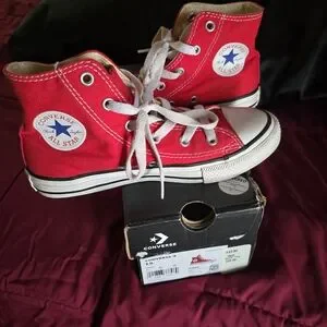Vibrant red Converse high-tops for kids. Classic design with durable build.