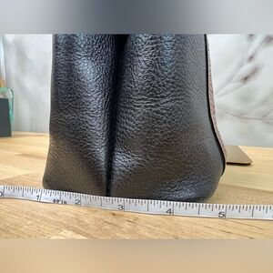 vintage Bally shoulder bag. unique dual-texture design, classic black pebbled leather with a rich cognac brown woven leather panel and trim. gold-tone chain accents is a touch of luxury.